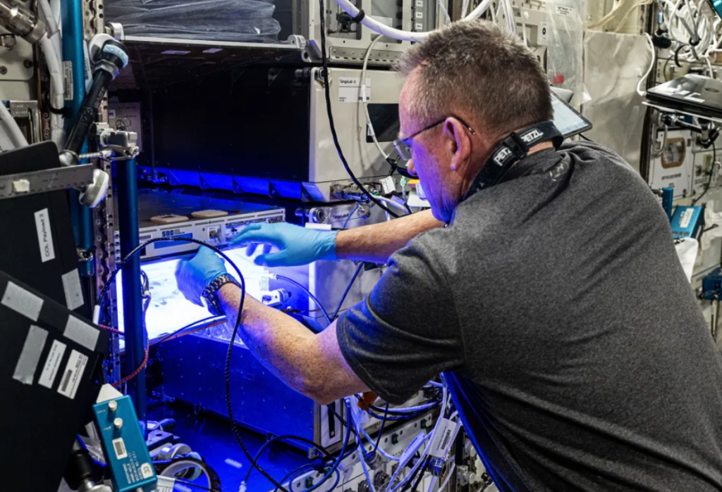Wilmore在空间站的植物学实验区操作植物研究设备。